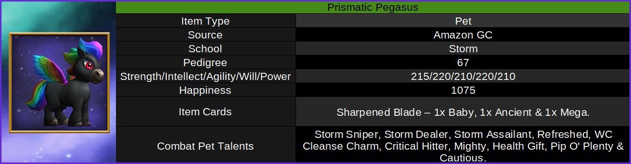 Wed, Jun 9th 2021/ V_r700139.Wizard_1_450: The 'Prismatic Pegasus' pet is modified to a Storm pet.